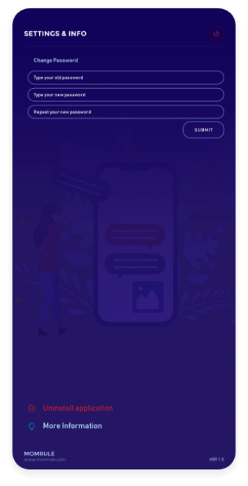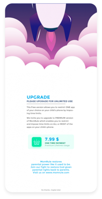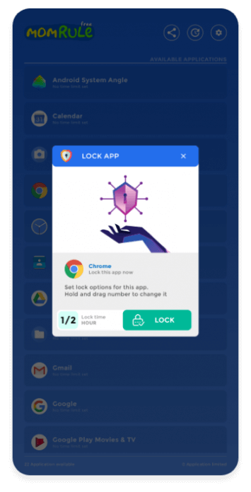 Momrule , once you grant it the power to control the other apps on your phone allows you to set a maximum limit per day of how much time a child can spend on each app on that phone. It simply enforces time limits for each app. Without the parental password Momrule cannot be uninstalled.